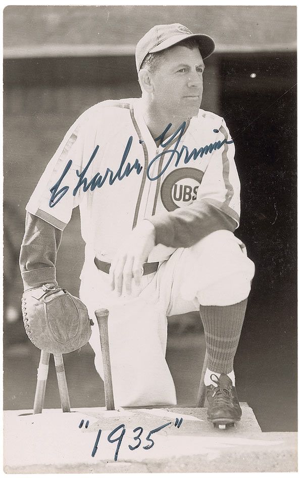 Semi-glossy 3.25 x 5.5 postcard photo of Grimm posing on the dugout steps in his Cubs uniform, signed in black felt tip, “Charlie Grimm, 1935,” the year the photo was taken. In fine condition.