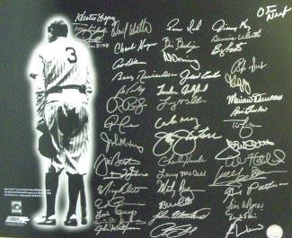 The New York Yankees are one of the AL's eight charter franchises. The club was founded in Baltimore, Maryland in 1901 as the Baltimore Orioles. The team moved to New York City in 1903 and became the New York Highlanders, before taking the "Yankees" as their official name in 1913. Yankees home games were played at Yankee Stadium from 1923 to 1973 and from 1976 to 2008. In 2009, they moved into a new ballpark also called Yankee Stadium after the previous venue closed. One of the most successful franchises in professional sports history, the Yankees have won 18 division titles, 40 AL pennants, and 27 World Series championships, all of which are MLB records. This 16x20 Photo has been hand signed by 48 New York Yankees players. Most famous players are: Tony Kubek, Charlie Hayes, Bobby Richardson, Bob Turley, John Wetteland, Jimmy Key, Hector Lopez, Jim Bouton, Larry McCall, Mariano Duncan and Otis Nixon. Certificate of Authenticity from Athlon Sports.