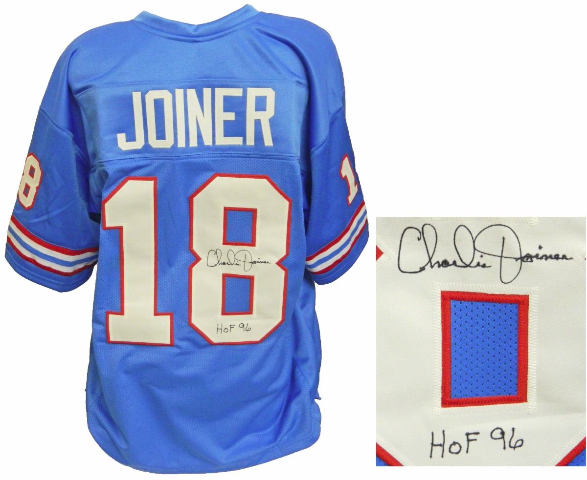 Charlie Joiner signed blue throwback custom football jersey with 'HOF 96' inscription. Item comes with a Schwartz Sports Memorabilia tamper-proof numbered hologram and Certificate of Authenticity which can be verified online.