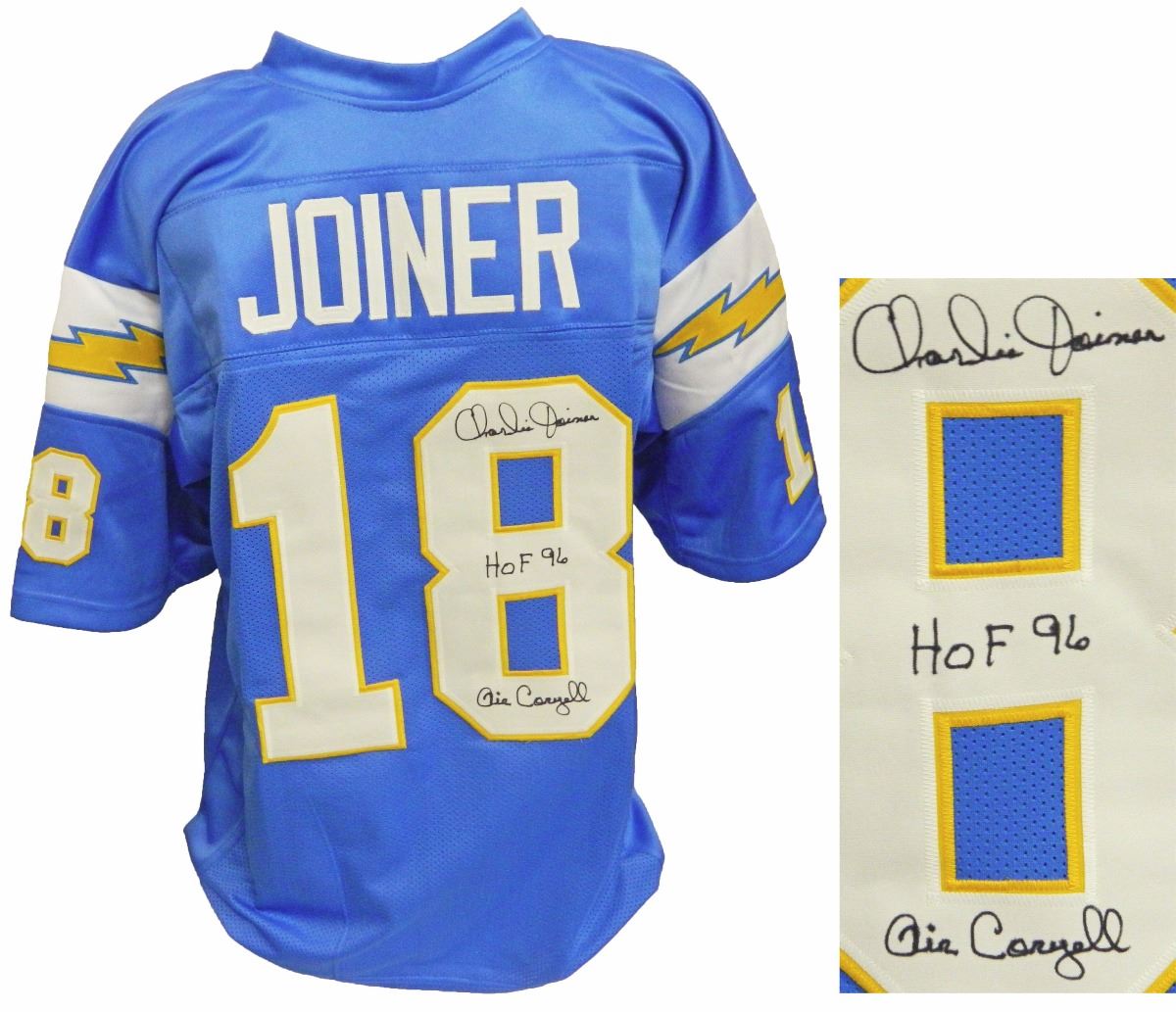 Charlie Joiner signed powder blue throwback custom football jersey with 'Air Coryell, HOF 96' inscriptions. Item comes with a Schwartz Sports Memorabilia tamper-proof numbered hologram and Certificate of Authenticity which can be verified online.
