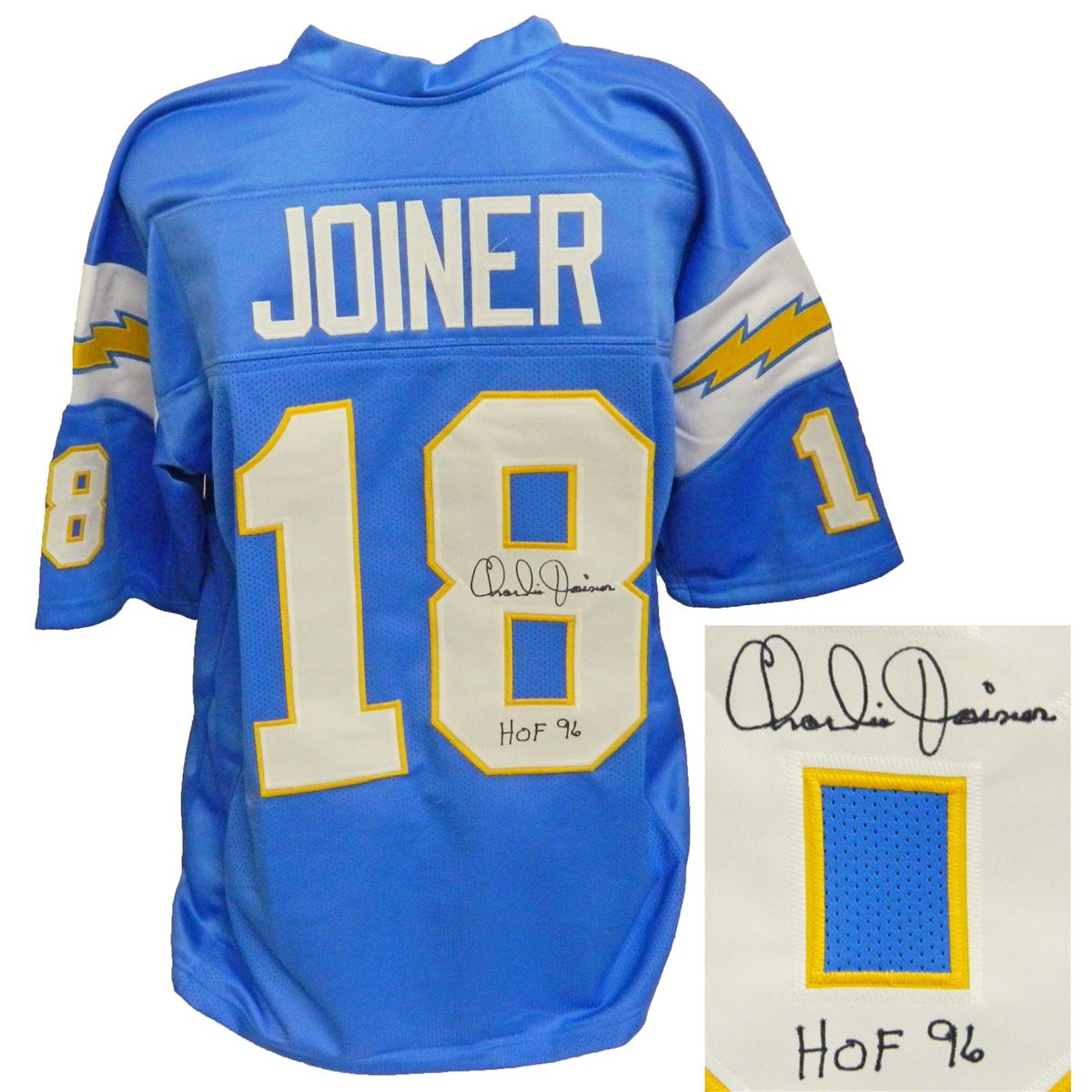 Charlie Joiner signed powder blue throwback custom football jersey with 'HOF 96' inscription. Item comes with a Schwartz Sports Memorabilia tamper-proof numbered hologram and Certificate of Authenticity which can be verified online.