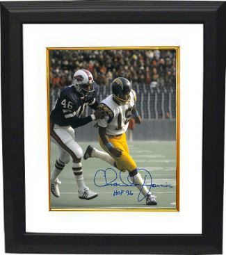 Charlie Joiner was elected into the Pro Football Hall of Fame in 1996. It was with the Chargers' high flying "Air Coryell" offense under coach Don Coryell that Joiner had his most productive years, exceeding 1,000 yards receiving in a season four times and going to three Pro Bowls (1976, 1979-80). Joiner was selected All-Pro in 1980 and 2nd Team All-AFC in 1976. Although he never played in a Super Bowl, Joiner helped the Chargers reach the AFC title game in the 1980 and 1981 seasons. Charlie Joiner has hand autographed this Chargers 8x10 Color Photo with HOF 96 Inscription. Certificate of Authenticity from Athlon Sports. Custom White Mat and Premium Black Frame as shown.
