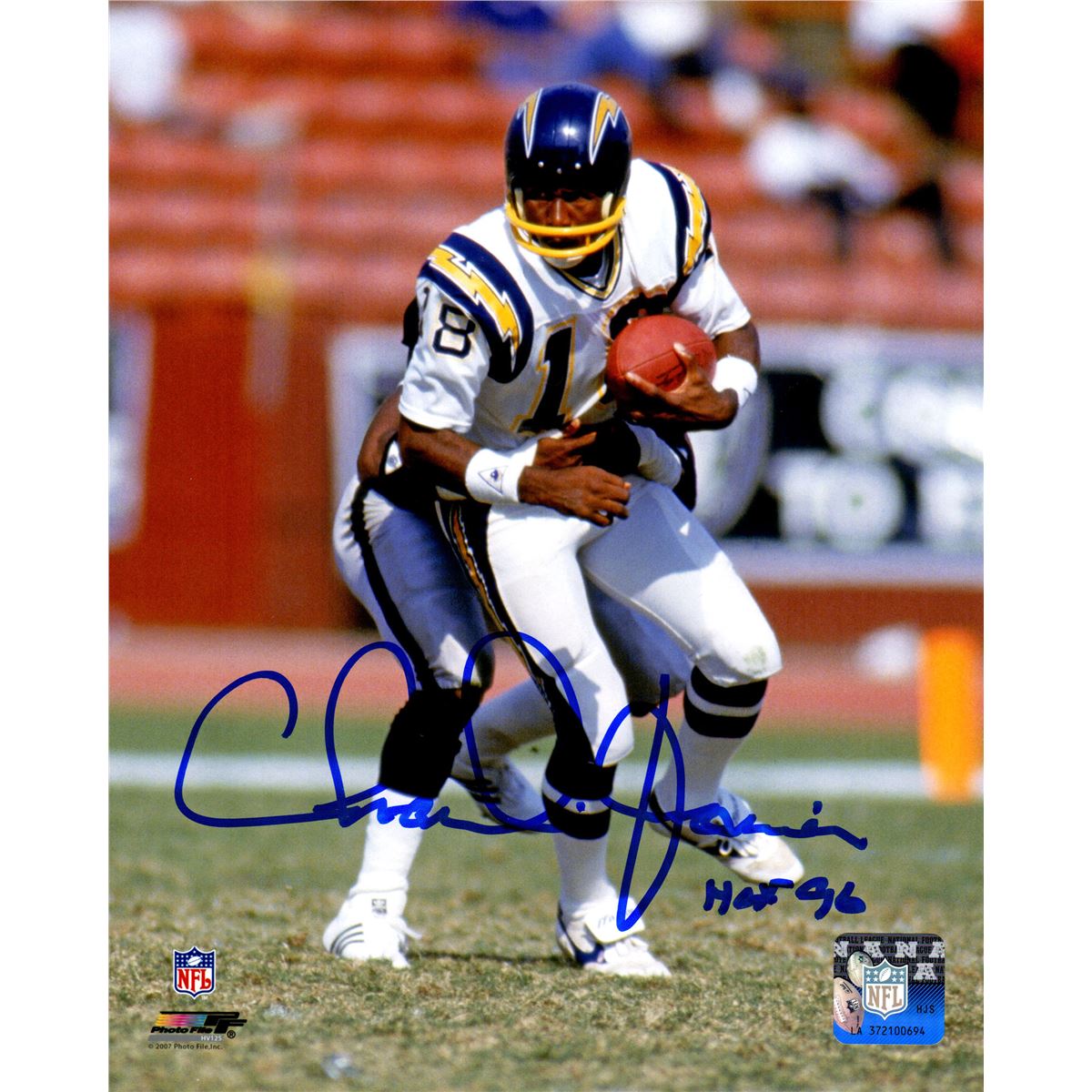 Charlie Joiner signed San Diego Chargers action 8x10 photo with 'HOF 96' inscription. Item comes with a Schwartz Sports Memorabilia tamper-proof numbered hologram and Certificate of Authenticity which can be verified online.