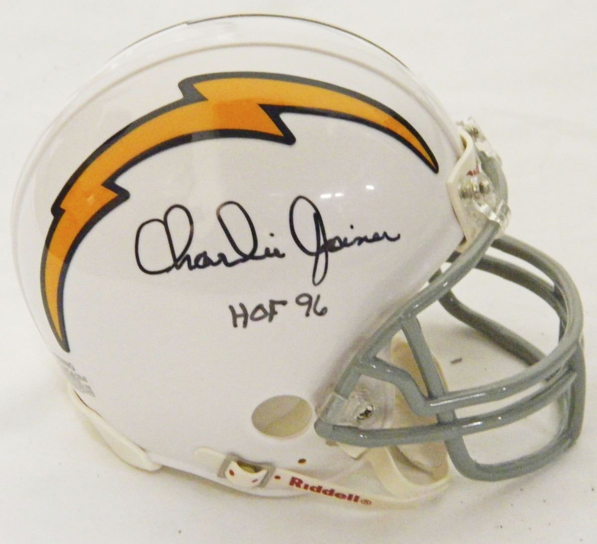 Charlie Joiner signed San Diego Chargers throwback white Riddell mini helmet with 'HOF 96' inscription. Item comes with a Schwartz Sports Memorabilia tamper-proof numbered hologram which can be verified online.