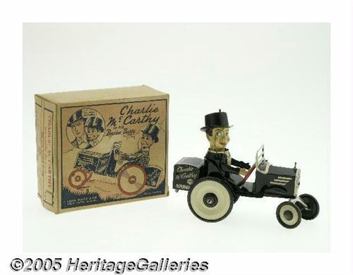<B>Charlie McCarthy in his Benzine Buggy with Box (Louis Marx & Co., 1938).</B></I> In 1938, you could buy one of these in the Sears Christmas catalog for a mere 49 cents! This dynamic Charlie McCarthy tin litho wind up measures 8" x 6.5". The car body and McCarthy figure are intact and in great shape, with no rust, and very little paint loss, overall in Excellent condition. Wind up key is missing. Complete with the original box, which is also in great condition, you've got yourself a real treasure! <I>From the Larry Jacobs Collection.</B></I>