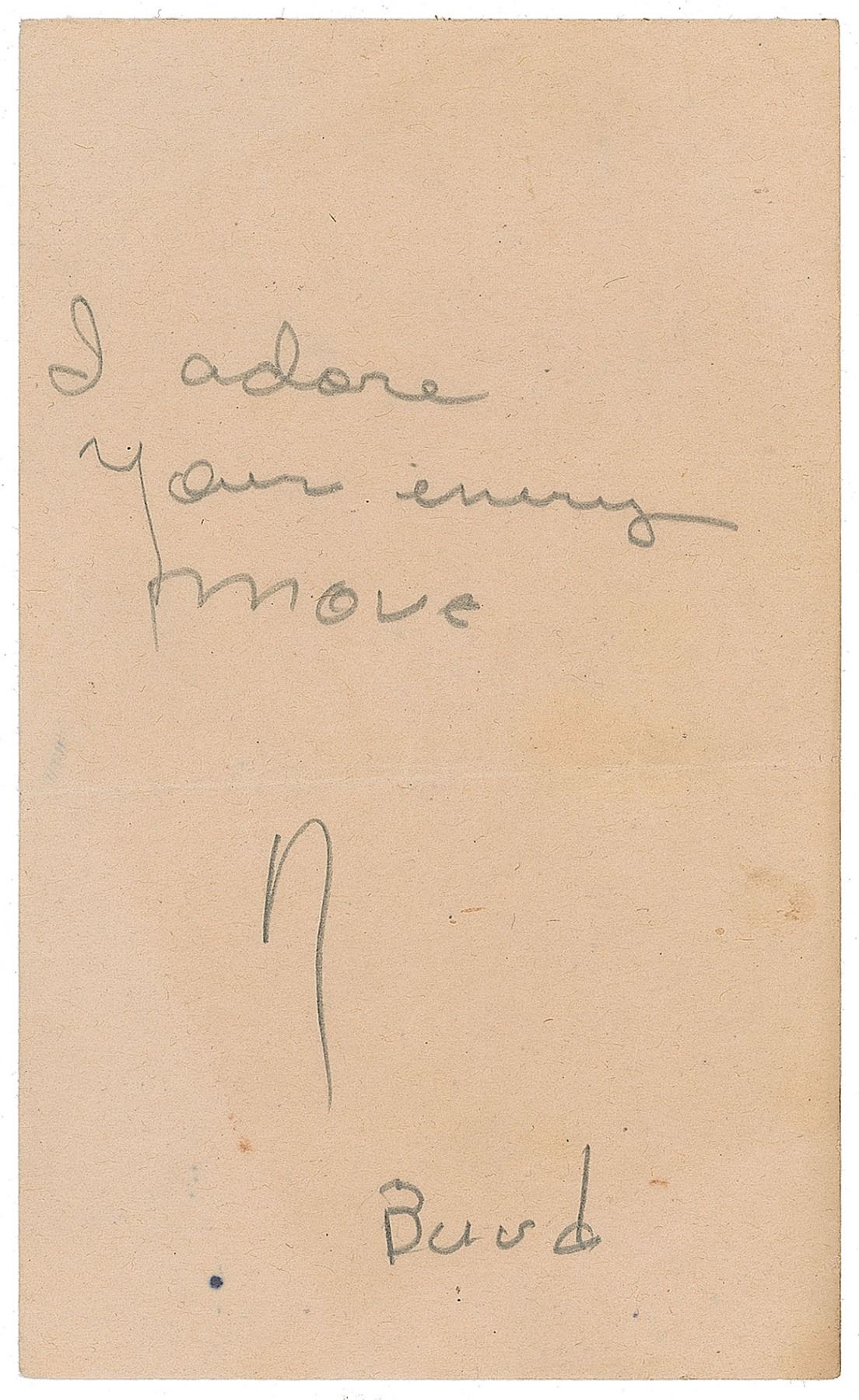 ANS in pencil, signed “Burd,” one page, 3 x 5, no date. A sweet note to his wife, Chan Parker, in full: "I adore your every move." In fine condition, with a central horizontal fold. A desirable autograph featuring Charlie Parker's famous nickname. Provenance: The Chan Parker Collection, Christie's, 1994. Charlie Parker often left Chan notes around the house professing his devotion to her, and with superb provenance this represents an excellent example. Parker's signature is sought-after in any form, and this one—signed with a version of his famous nickname—is ideal.