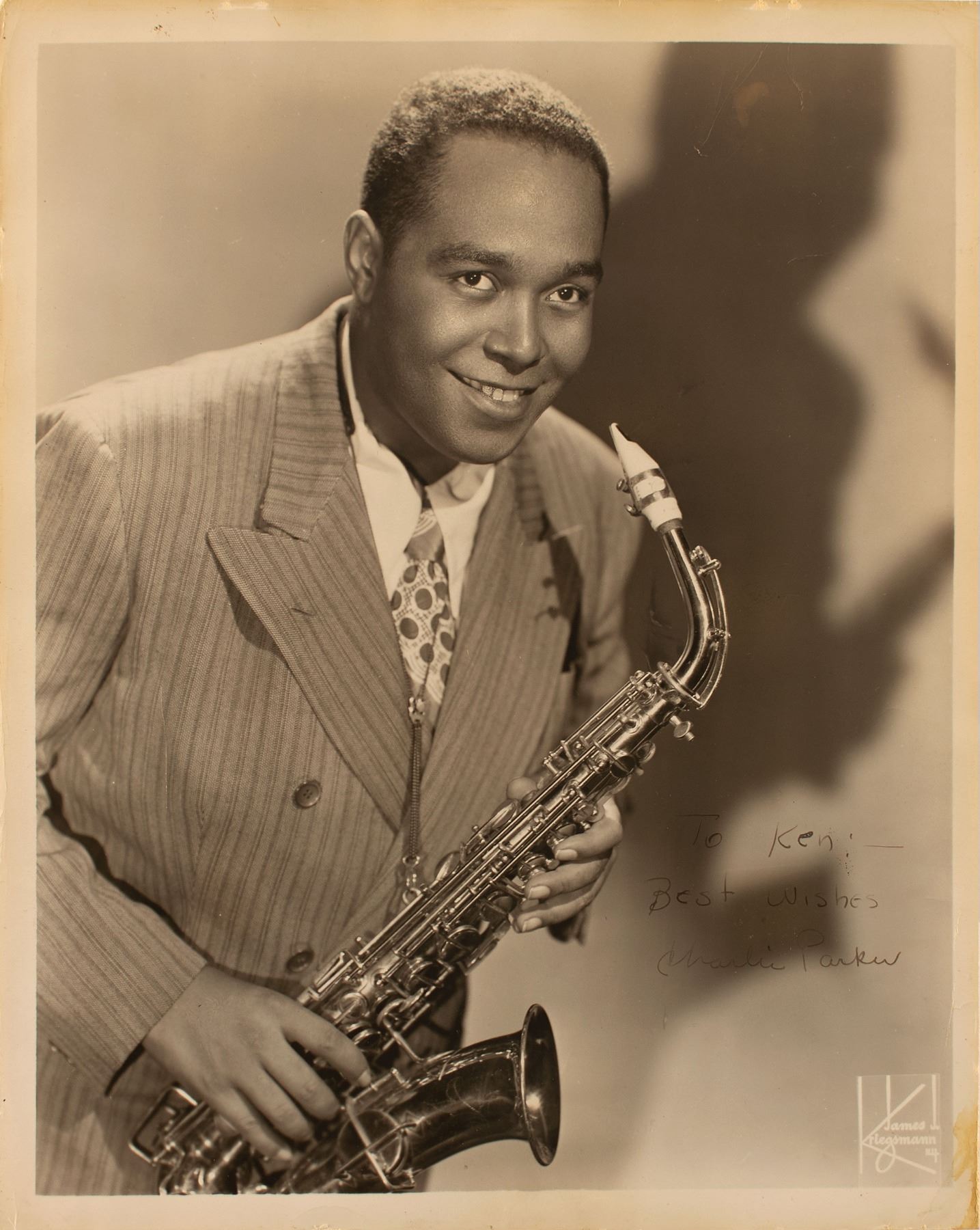Fabulous vintage glossy 8 x 10 publicity photo of Parker posing with his saxophone by James J. Kriegsmann, neatly signed and inscribed in fountain pen, "To Ken:—Best wishes, Charlie Parker.” In very good to fine condition, with scattered creasing and moderate signature contrast. A brilliant pose of Parker, who is extremely rare in signed photos of this size and quality.