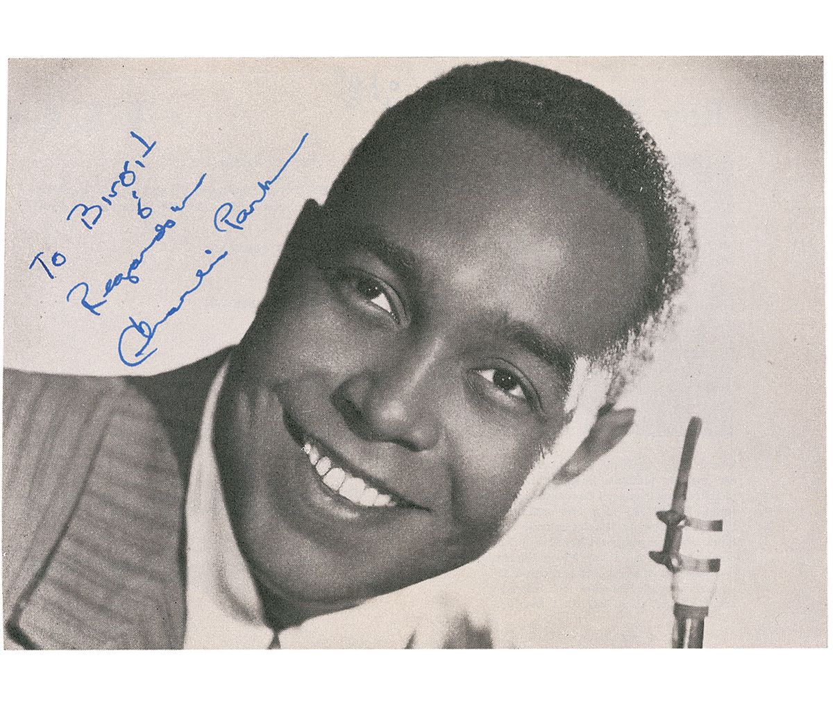 Considered one of the most influential jazz musicians ever, Parker and Dizzy Gillespie helped develop Bebop as a reaction against the prevalent swing music of the period. His personal life was not as successful—plagued by troubles which included drugs and alcohol and suicide attempts. Vintage 8 x 5.75 photo, clipped from a foreign tour program, signed and inscribed in fountain pen “To Birgit, Regards, Charlie Parker.” Reverse is signed by Roy Eldridge. In fine condition. Signed images of Parker, no matter what size, are always scarce and desirable.
