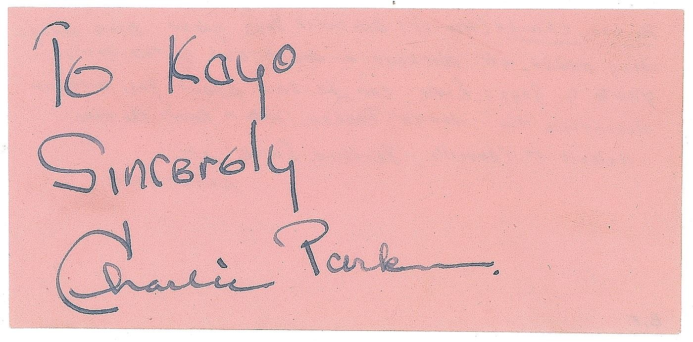 Attractive vintage fountain pen signature and inscription, "To Kayo, Sincerely, Charlie Parker,” on a pink 4.5 x 2.25 slip. In fine condition. The original recipient, “Kayo,” assembled a well-known in-person collection through his job as a train conductor, where he acquired celebrities’ autographs as they rode the train. An exceptional autograph of 'Bird,' a revolutionary saxophonist who remains exceedingly scarce and hugely sought after across all formats.