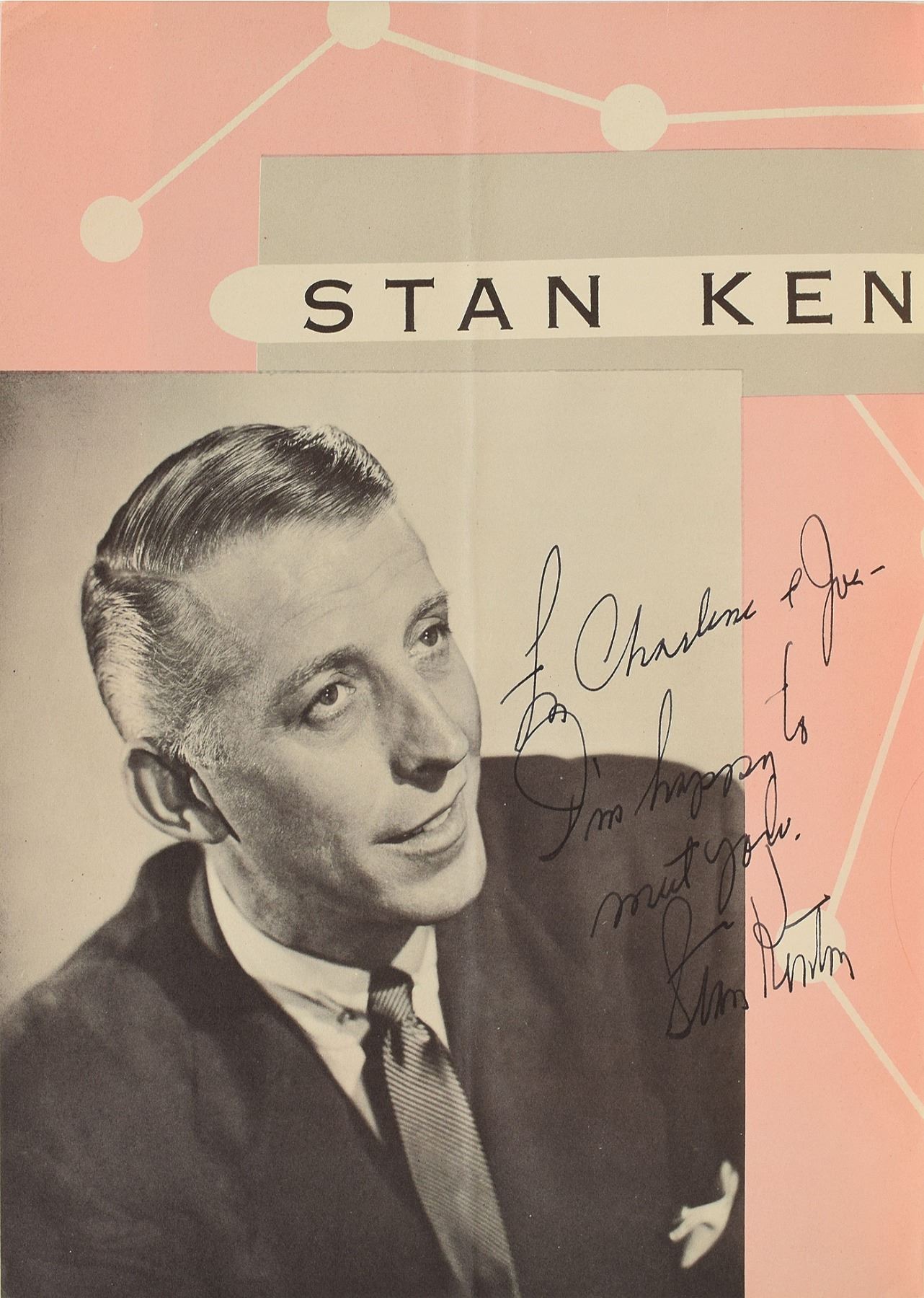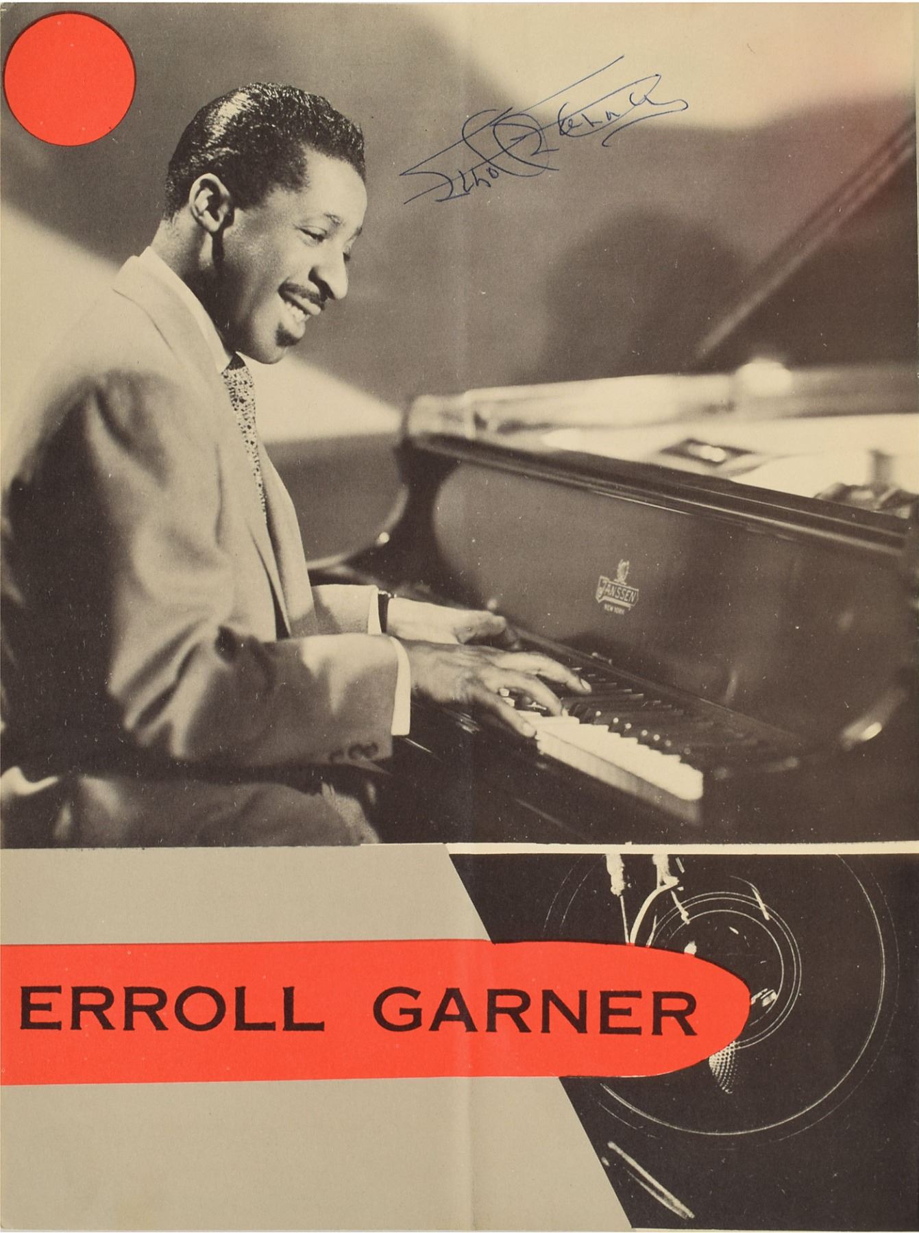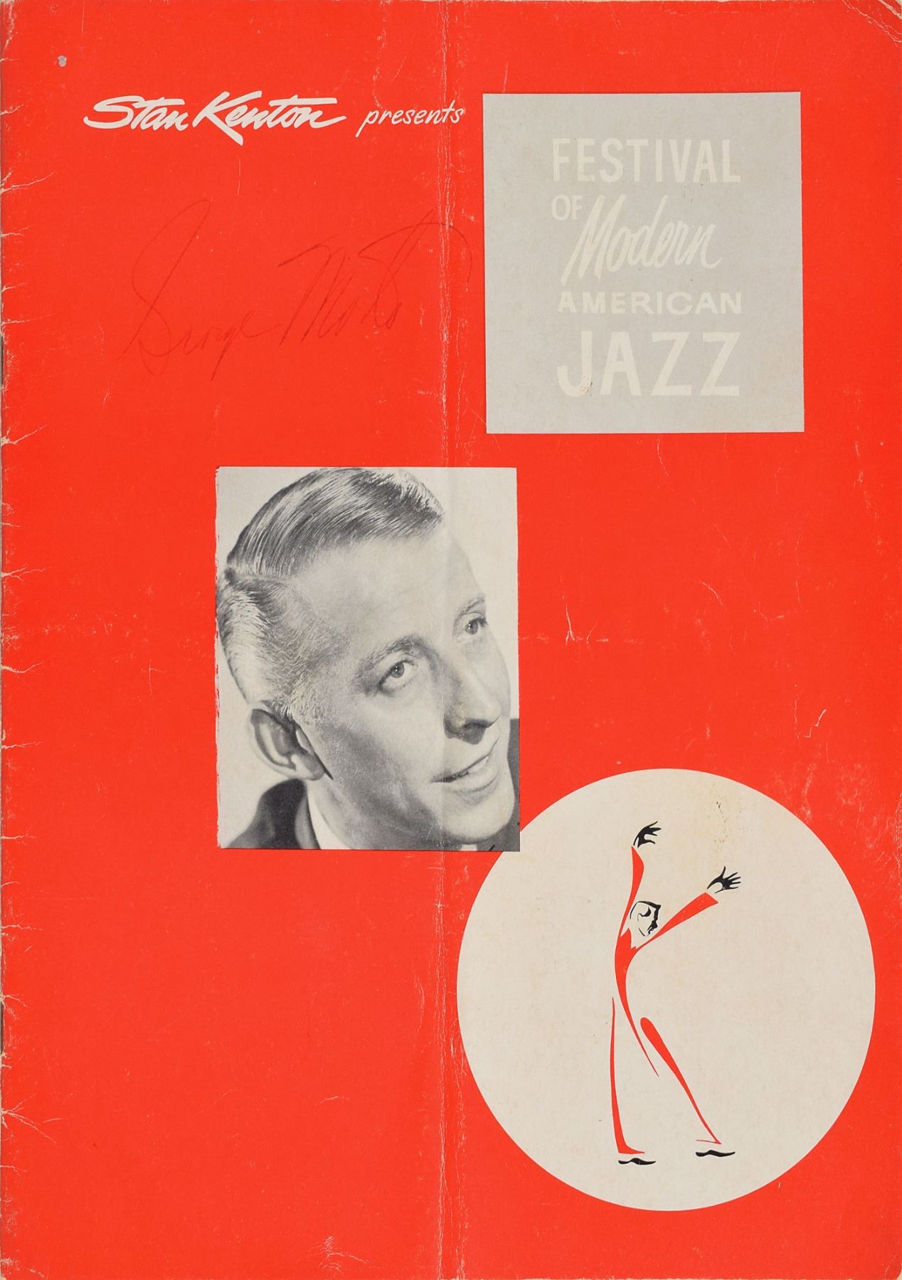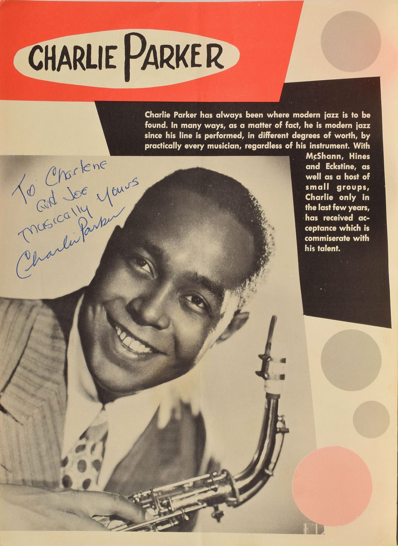 Fantastic program for the 1954 Festival of Modern American Jazz presented by Stan Kenton, 9 x 12, boldly signed and inscribed inside on his image in blue ballpoint, "To Charlene and Joe, Musically Yours, Charlie Parker." Also signed inside by Stan Kenton, Erroll Garner, June Christy, Dizzy Gillespie, Lee Konitz, and Candido, plus a few other festival performers. In very good to fine condition, with general handling wear, and central vertical and horizontal folds. A scarce and sought-after autograph from the bebop icon.