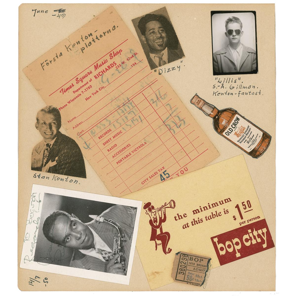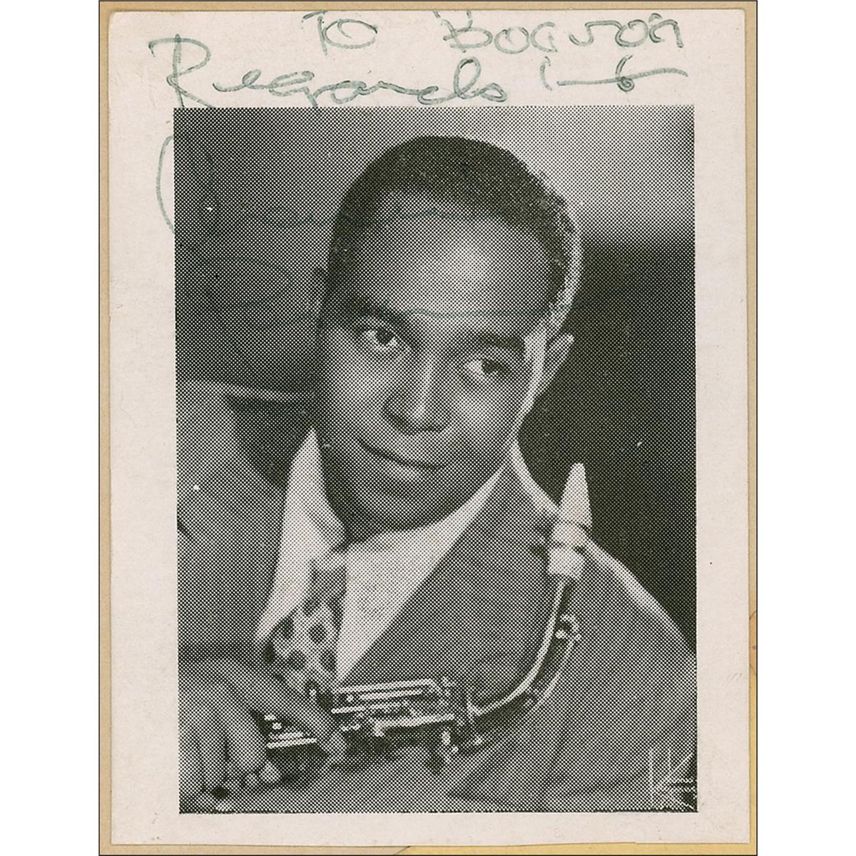 Rare cardstock 2.75 x 3.5 photo of Parker in a half-length pose holding his saxophone, signed and inscribed in black fountain pen “To Bogson, Regards, Charlie Parker.” Photo is affixed to an 8.25 x 9.25 sheet on which is noted the dated July 14, 1950, presumably when the signature was obtained, and decorated with a ticket stub and drink card from the Bop City jazz club in New York City and a few other decorative images, including newsprint images of Dizzy Gillespie and Stan Kenton. In fine condition, with the ink slightly faded.