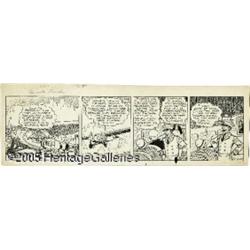 <B>Charlie Plumb - Ella Cinders Daily Comic Strip Original Art, dated 9-25-29 (Metropolitan Newspaper Service, 1929).</B></I> Skimming over the skies toward Hollywood, riding on silver-lined clouds with a contract for "talking pictures" in her purse, Ella Cinders has nothing to complain about! Published at the height of her comic strip power, this <I>Ella Cinders</B></I> daily strip from September 25, 1929 was created by writer and artist team, Bill Conselman and Charlie Plumb. A very pleasant strip, Plumb's art is strong and well-balanced and features some great airplane shots. The art measures 21" x 7" and has a 20" x 5.5" image area. There is some slight aging apparent, otherwise this work is in Excellent condition.
