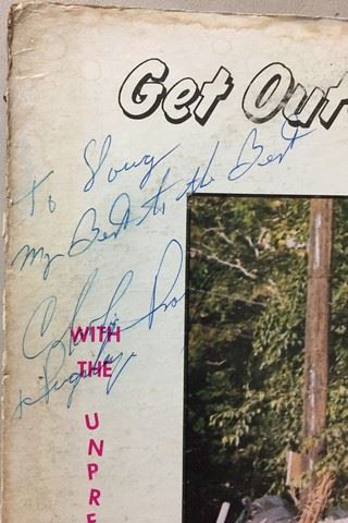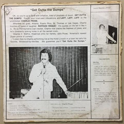 Charlie Prose "Get Outa the Dumps" Recorded Live at the Hotel Lincoln Wildwood-by-the-sea, N.J (1971) vinyl record, 18 songs between the two sides, songs include "I was in the service", "My yearly urge", "Polish Spaceship", etc., Charlie Rose autograph with personal messages stating "My best to the best, Charlie Rose" and "2/29/84 I can't believe you still have this old gem. Charlie Rose".