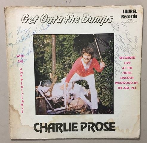 Charlie Prose "Get Outa the Dumps" Recorded Live at the Hotel Lincoln Wildwood-by-the-sea, N.J (1971) vinyl record, 18 songs between the two sides, songs include "I was in the service", "My yearly urge", "Polish Spaceship", etc., Charlie Rose autograph with personal messages stating "My best to the best, Charlie Rose" and "2/29/84 I can't believe you still have this old gem. Charlie Rose".