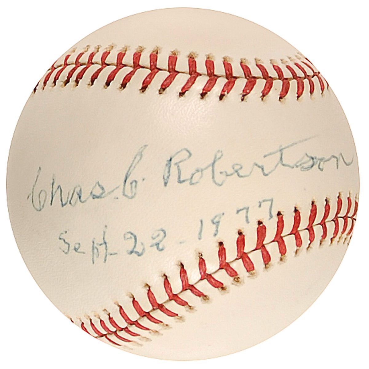 Official Spalding National League baseball signed in blue ballpoint on a side panel and extending onto the sweet spot, “Chas. G. Robinson, Sept 22. 1977.” In fine condition.