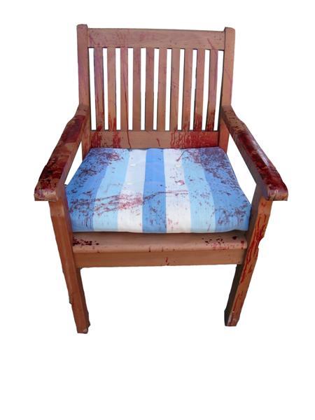 Scream 4 - Very bloody, brown wood chair with blue and white cushion. Oversized item. Additional postage required. This is the chair that Charlie (Rory Culkin) is taped to by Ghostface outside the house.