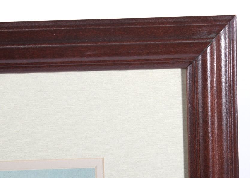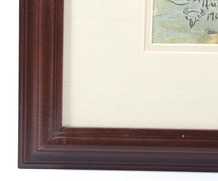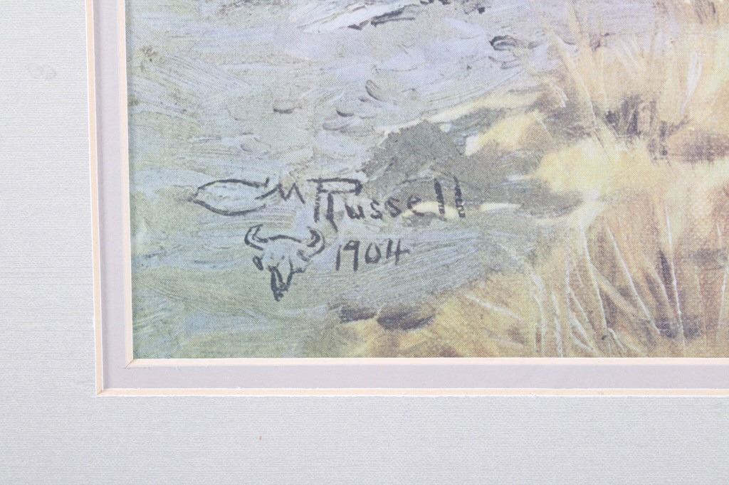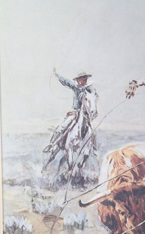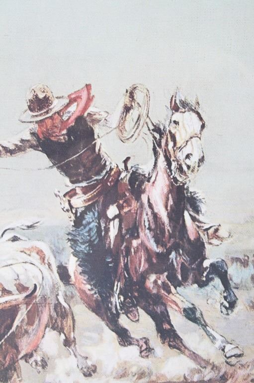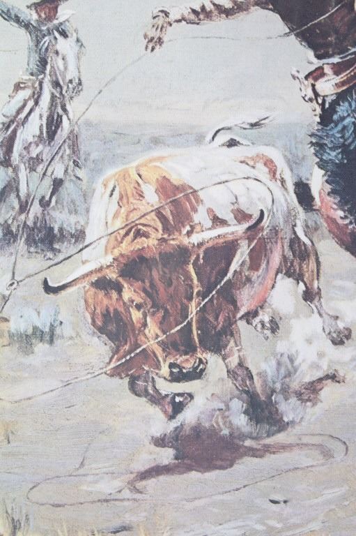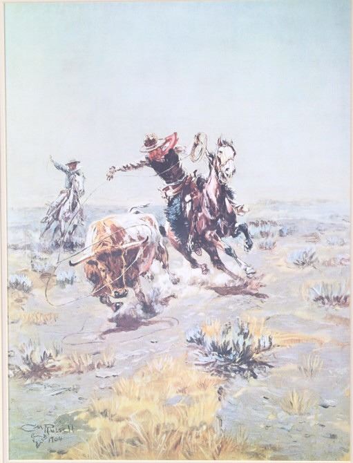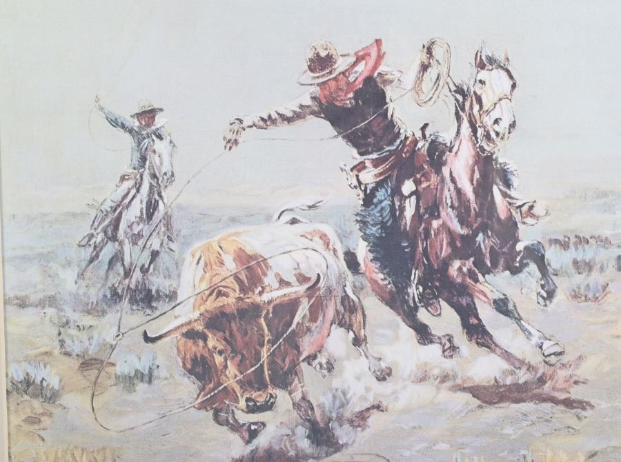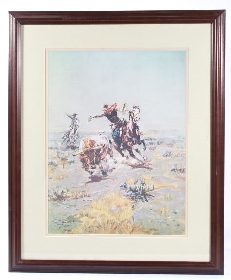 Included in this lot we have a framed Charlie Marion Russell print titled "Cowboy Roping a Steer". Charles Marion Russell, born March 19th, 1864 in St. Louis Missouri and died on October 24, 1926 in Great Falls Montana. Russell is known for his paintings of cowboys, Indians, and western landscapes, as well as crafting bronze sculptures. This print depicts two cowboys galloping on horse back and working on roping a running steer. The figures are shown on a flat sage covered valley with dust raising from the hooves. The piece is signed in the bottom left hand corner reading "C M Russell 1904". The print is set into a custom wood frame with a light tan border around the piece. The piece shows good condition overall with some minor wear across the frame. The frame measures 23 3/4" wide by 28 3/4" tall with the art measuring 15" wide by 20" tall.