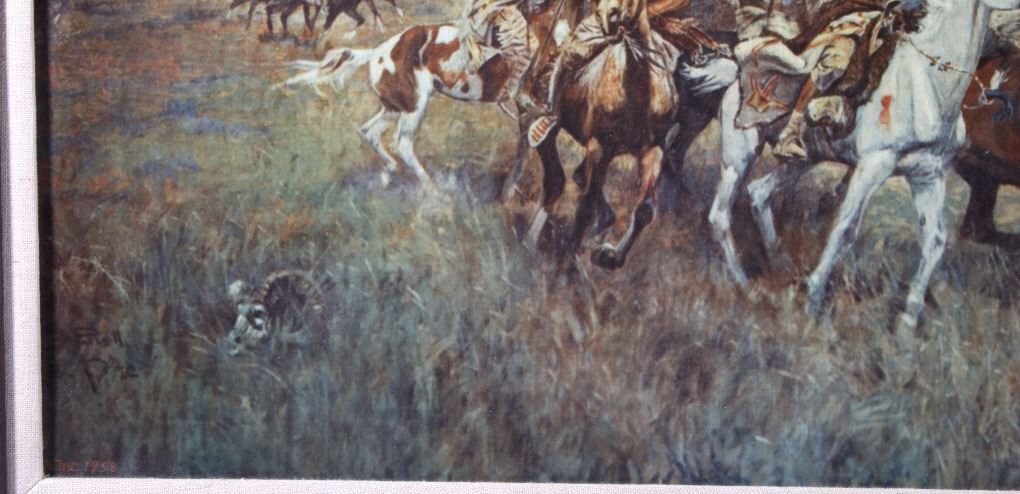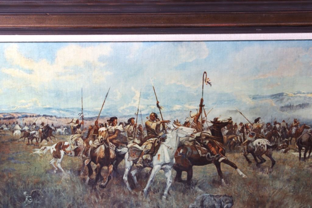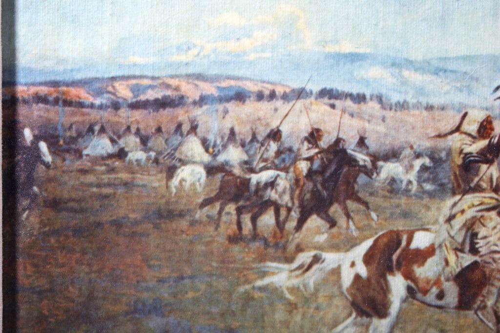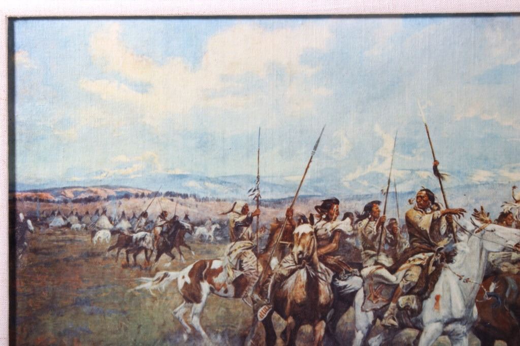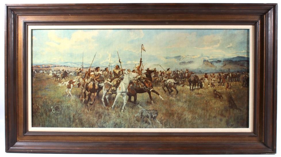 Featured in this lot we have a Charlie Russell G-clay on canvas titled "Lewis and Clark Meeting the Flathead Indians at Ross Hole" circa 1912. The image shows a large group of Flathead Indians all on horse back with a number of dogs or wolves in the foreground with Lewis and Clark on the right side with trading goods. The image shows wonderful detail and color in the piece. The G-Clay is framed with a nice stained oak frame with a plain canvas border. The piece is in good condition overall with some slight wear on the frame. The frame measures 36" wide by 19 3/4" tall.