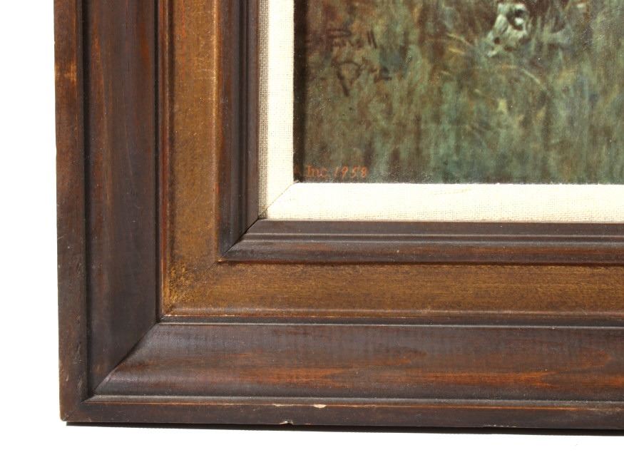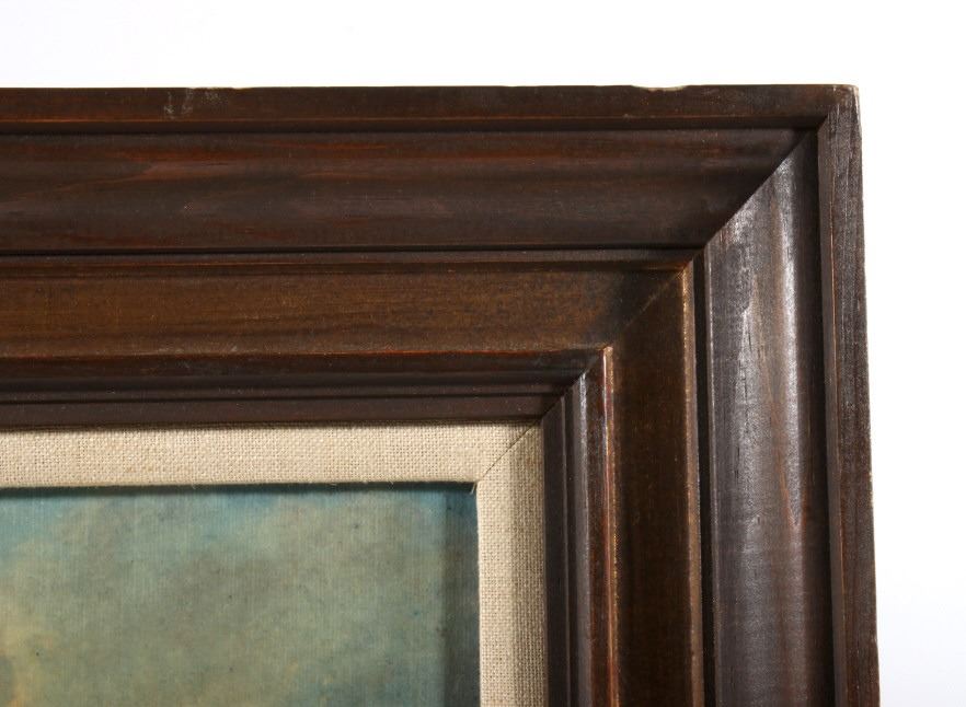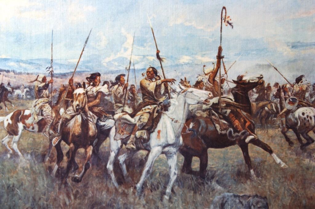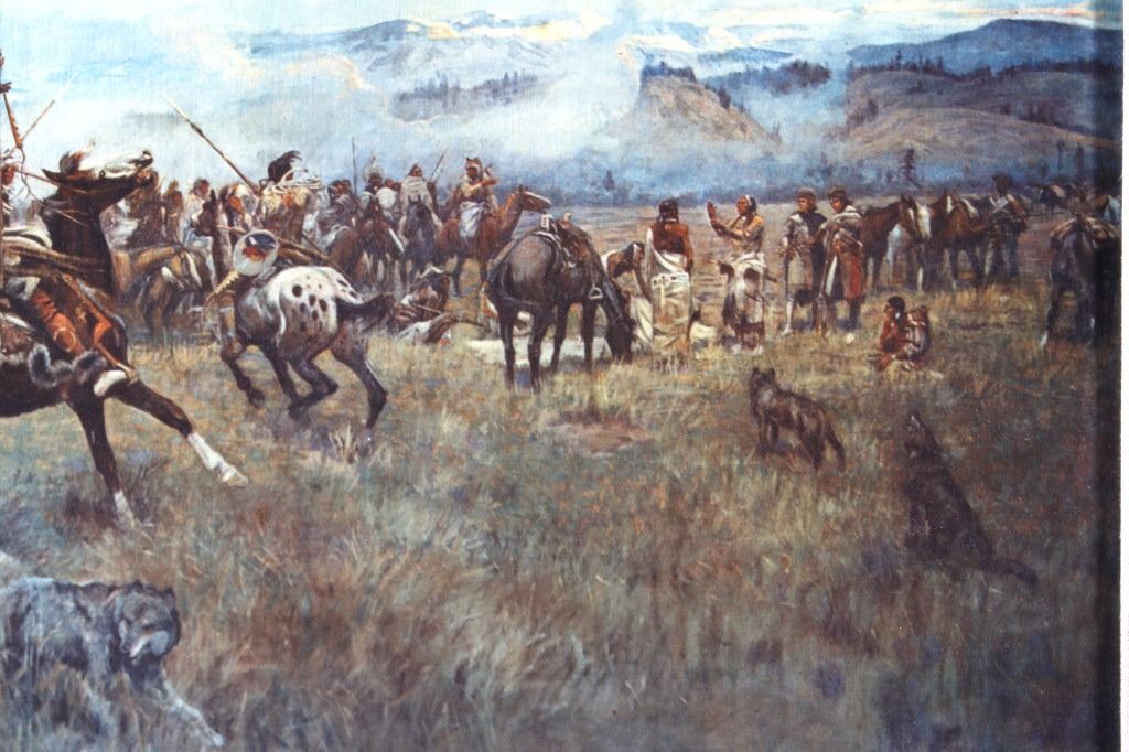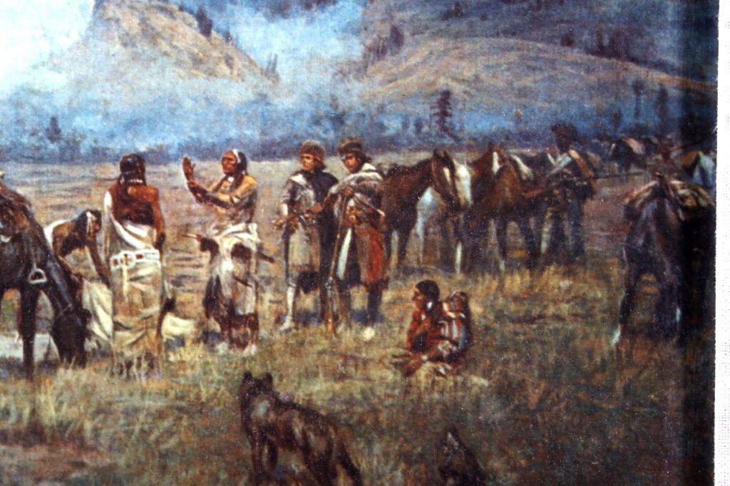 Featured in this lot we have a Charlie Russell G-clay on canvas titled "Lewis and Clark Meeting the Flathead Indians at Ross Hole" circa 1912. The image shows a large group of Flathead Indians all on horse back with a number of dogs or wolves in the foreground with Lewis and Clark on the right side with trading goods. The image shows wonderful detail and color in the piece. The G-Clay is framed with a nice stained oak frame with a plain canvas border. The piece is in good condition overall with some slight wear on the frame. The frame measures 36" wide by 19 3/4" tall.