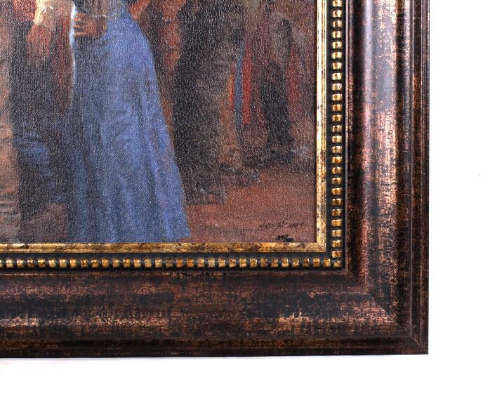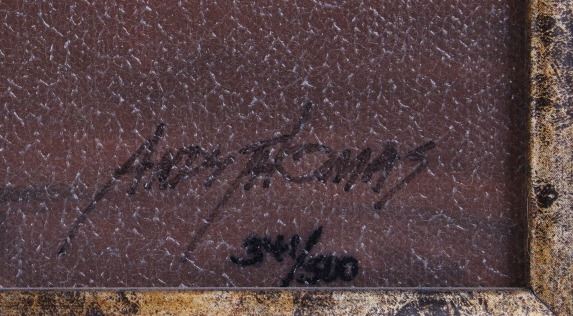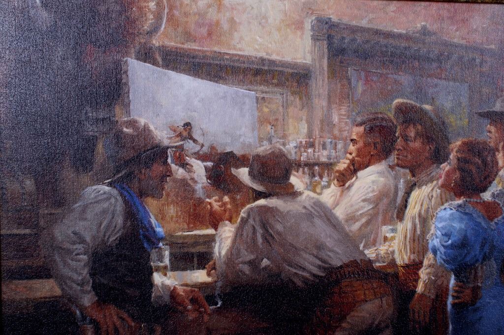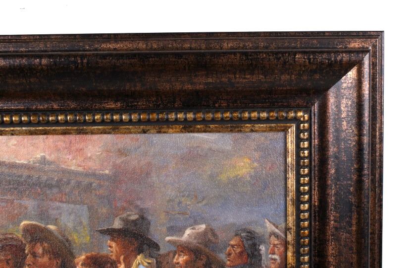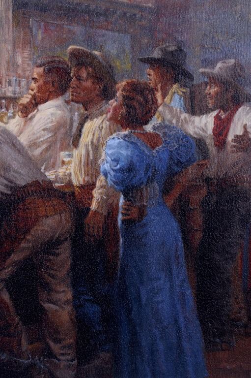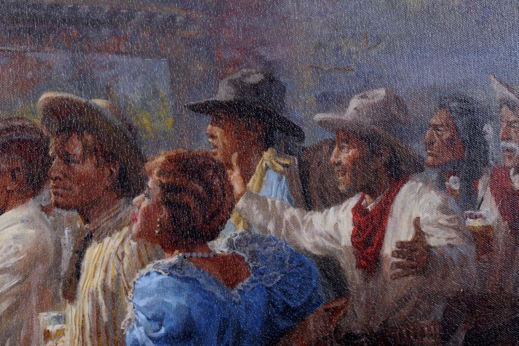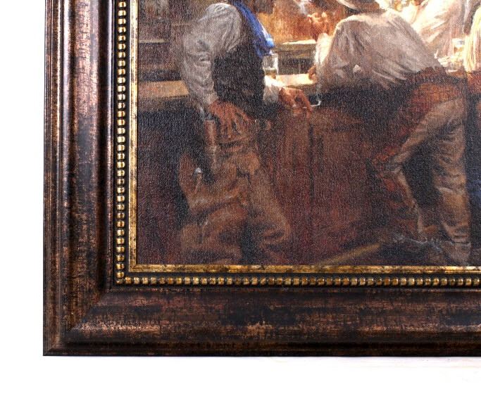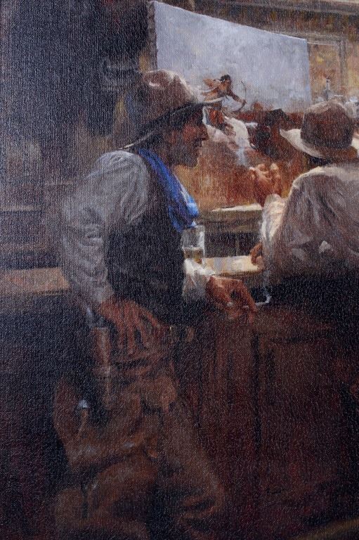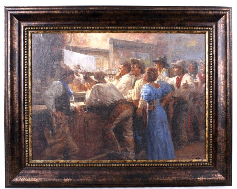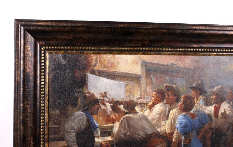 For your bidding pleasure is this painting called Charlie Russell and His Characters by Andy Thomas. This painting shows great attention to detail, showing a oil painting representation of Charlie Russell and the characters he painted all congregated around the bar all looking at the newest addition to his collection. This concept of an artist painting another artist painting is a unique and refreshing picture that leaves you inspired and awestruck. This painting is signed with Andy Thomas's signature and is also numbered 341/500. The measurements of this framed canvas painting are 28 3/4" x 35 1/2".