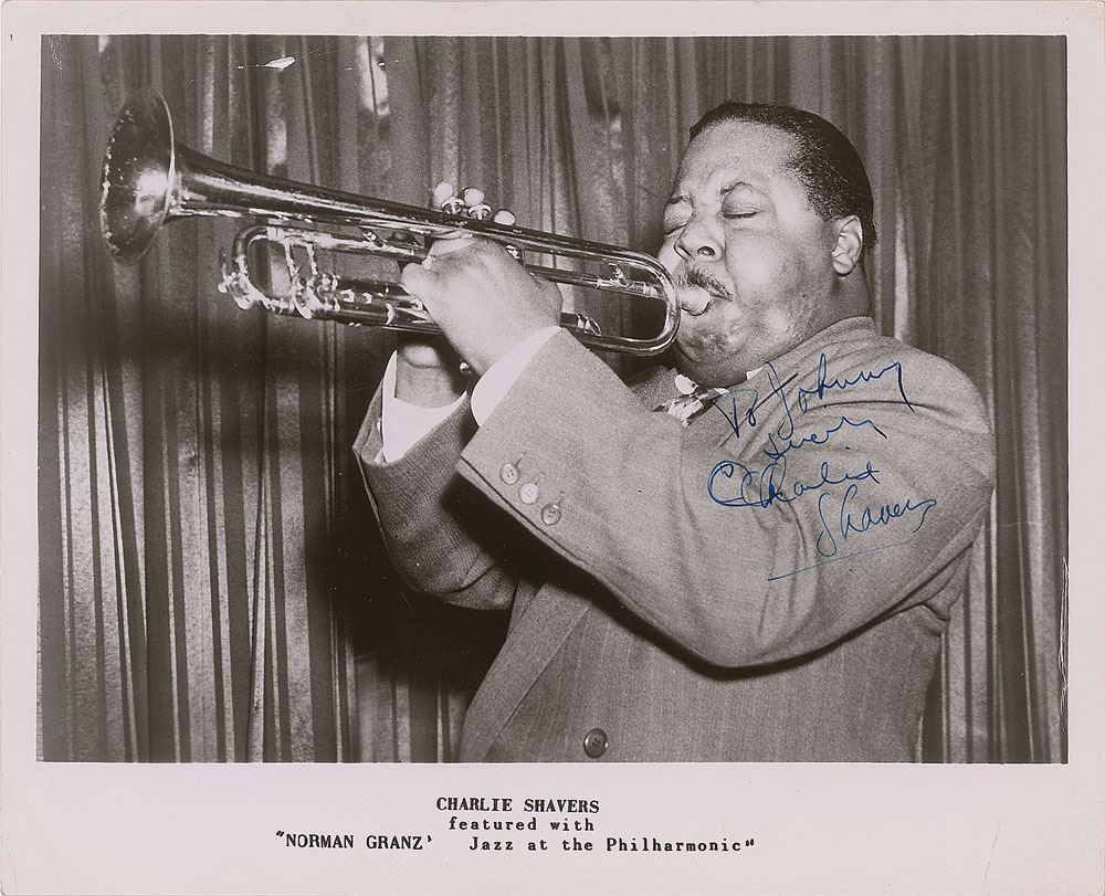 American swing era jazz trumpeter, arranger and composer (1920–1971) who played with Dizzy Gillespie, Roy Eldridge, Sidney Bechet, Billie Holiday, and many more. One of his compositions, 'Undecided,' is a jazz standard. Uncommon vintage glossy 10 x 8 publicity photo of Shavers, eyes closed, intently playing his trumpet in a half-length pose, signed and inscribed in fountain pen, "To Johnny, Sincerely, Charlie Shavers.” In fine condition, with some creasing near the top edge resulting in a fleck of missing emulsion.