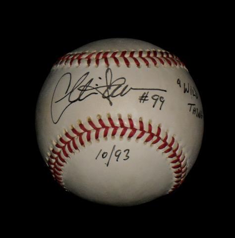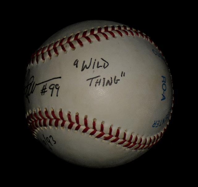 Charlie Sheen Autographed Baseball - A Rawlings official baseball signed on by Charlie Sheen with his number, #99 and "Wild Thing", the character he played in the Major League franchise. He also dated it 10/93. Acquired at a charity event thrown by John Stamos.