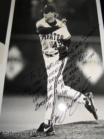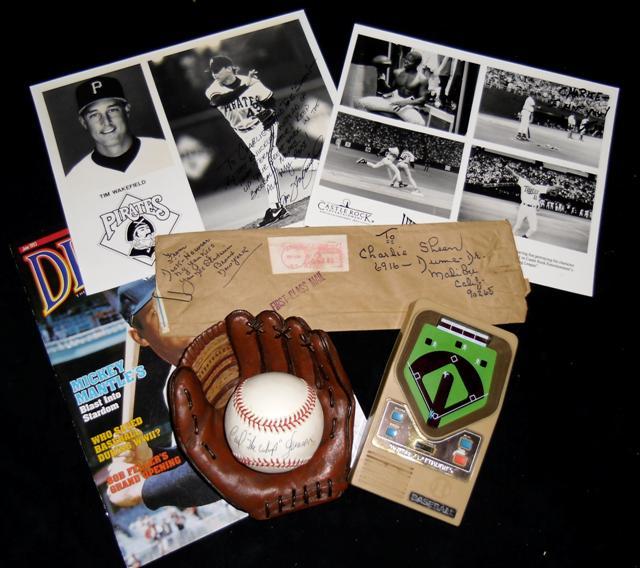 Charlie Sheen Baseball Related Items - From a personal collection of items owned by Charlie Sheen, an assortment of baseball items including a personalized note and signed publicity still from Tim Wakefield, a baseball in a mitt holder signed by actor Paul "The Whip" Gleason (famous for his role in The Breakfast Club and starred with Charlie Sheen in The Shadow Conspiracy), a handwritten shipping label to Charlie Sheen from Dick Howser of the N.Y. Yankees, an autographed publicity still from Little Big League from his friend actor Tony Todd, a handheld Mattel Baseball game and a Diamond baseball magazine. Includes Auction house documentation.