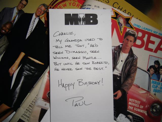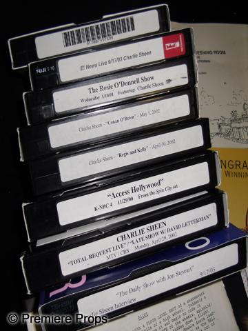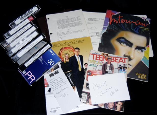 Charlie Sheen Media Related Items - From a personal collection of items owned by Charlie Sheen: an assortment of items, including 5 VHS video tapes of appearances on talk shows and entertainment news shows from 2000-2003, a screening VHS copy of "In America", a blueprint proposal for a screening room in his Malibu home, a copy of Interview Magazine with him on the cover, a copy of Variety with his full page cover congratulating him on his Golden Globe win for Spin City, a vintage Teen Beat magazine, a personal Christmas Card, a Happy Birthday note on a buck slip from a Men In Black producer, a script for a TV pilot called "Summer" in a Marriot Resort folder. Includes Auction house documentation.