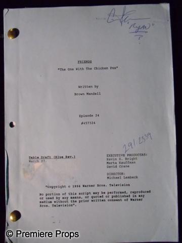 Charlie Sheen Personal Script from "Friends" - The complete screenplay for the episode of Friends titled "The One With The Chicken Pox" which starred Charlie Sheen. This was his personal script which is signed by him in the top right corner with his character name "Ryan" and with his notations inside. This is the "signature" way he personalizes his copy of a screenplay. From a personal collection of items owned by Charlie Sheen. Includes Auction house documentation.