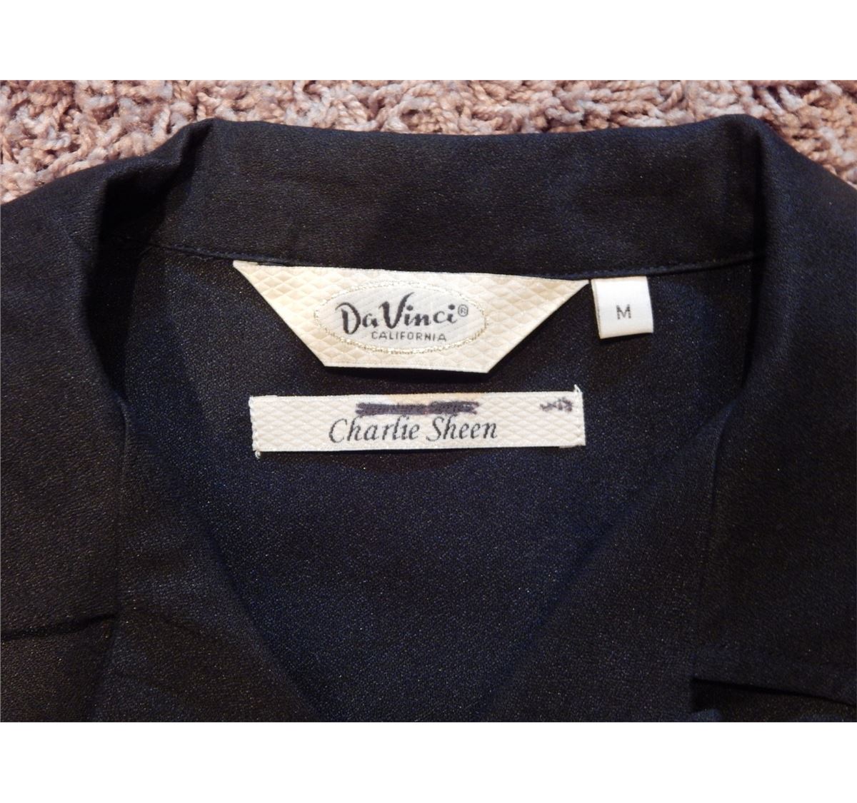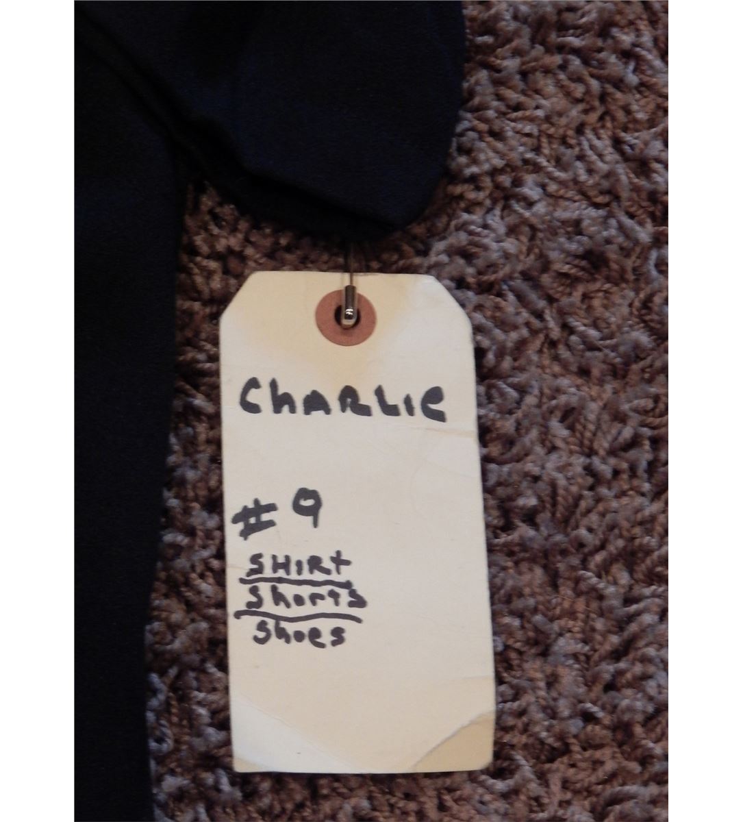 Khaki slacks, blue shirt with custom label for Charlie Sheen, and shoes worn in multiple episodes of television's "Two and a Half Men" with wardrobe tag and Star Wares letter of authenticity.
