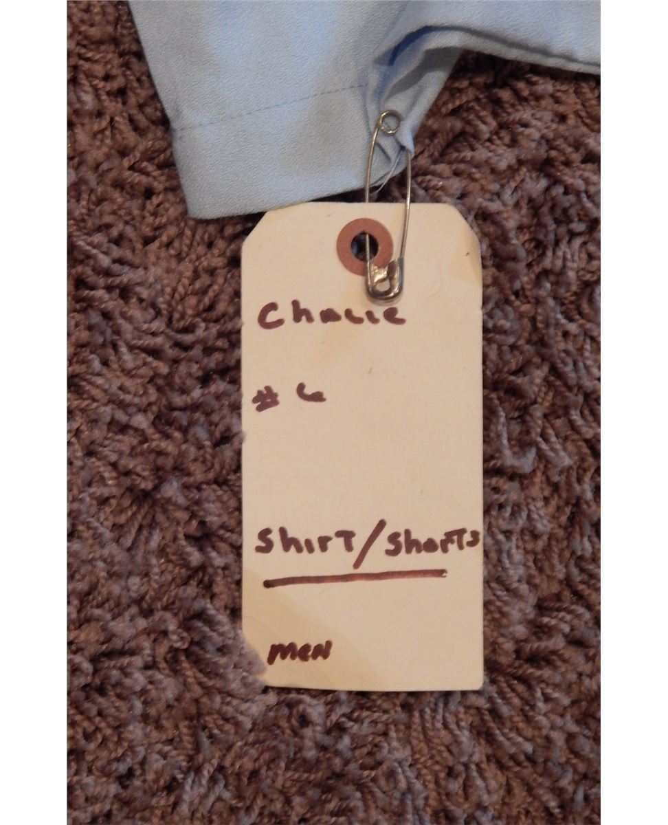 Khaki slacks, blue shirt with custom label for Charlie Sheen, hat, and wrist watch worn in multiple episodes of television's "Two and a Half Men" with wardrobe tag and Star Wares letter of authenticity.