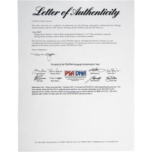 <B>Charlie Watts Signed Drum Head.</B></I> A 10.5" Remo drumhead signed by Rolling Stones drummer Charlie Watts in blue marker. In Excellent condition. <I>Accompanied by a COA from PSA/DNA.</B></I><BR><BR><b>Shipping:</b> Flat Material, Small (<a target="_blank" href="http://www.heritageauctions.com/common/shipping.php">view shipping information</a>)