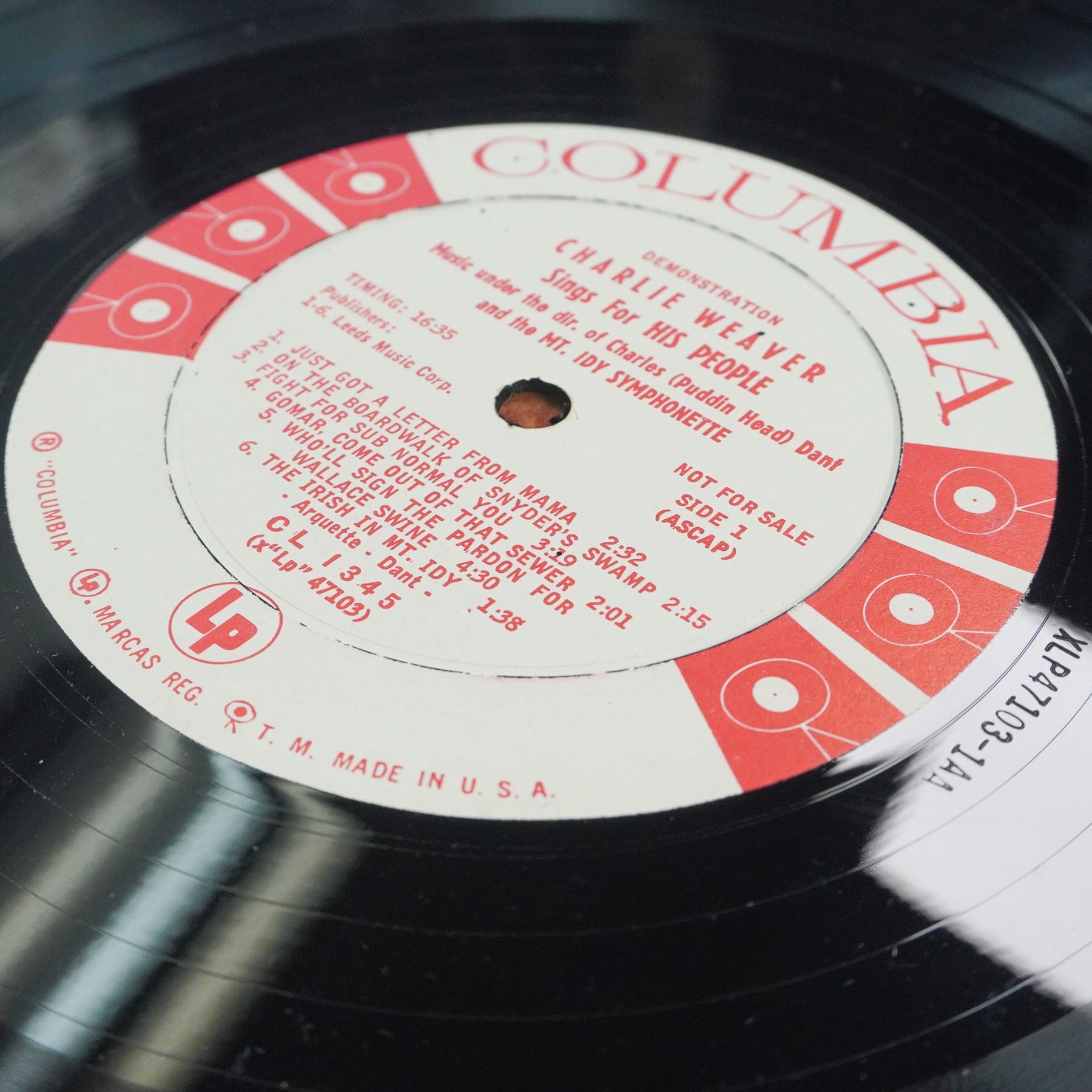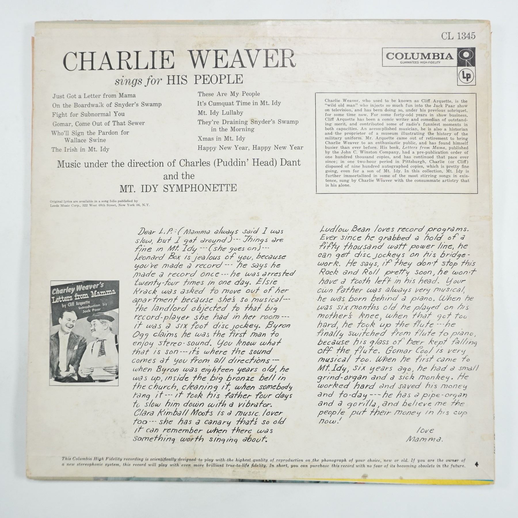 Vintage 1959 vinyl LP titled Charlie Weaver Sings for His People, released by Columbia Records (CL 1345). The album features Cliff Arquette as his comedic alter ego, Charlie Weaver, delivering humorous and satirical musical pieces alongside the Mt. Idy Symphonette. Includes tracks such as Just Got a Letter from Mama, On the Boardwalk of Snyder's Swamp, and Mt. Idy Lullaby. The record label reads "Demonstration - Not for Sale," indicating a promotional copy.
