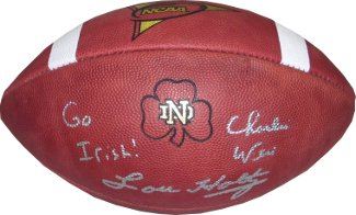 Lou Holtz was one of the premier college football head coaches of all time. Coach Holtz is the only coach in NCAA history to ever lead six different programs to bowl games and likewise is the only coach to ever guide four different programs to final top 20 rankings. He reached the pinnacle of his career in 1988 when he led Notre Dame to a National Championship and was named National Coach of the Year (for the second time). Charlie Weis was named Notre Dame's 28th head football coach on December 12, 2004. Lou Holtz and Charlie Weis have hand signed this Notre Dame Official Wilson Logo Football . A Steiner Sports Hologram and Certificate of Authenticity is included.
