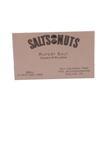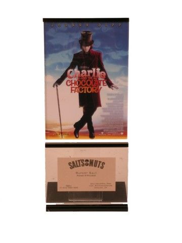 In Tim Burton's version of the beloved "Charlie and the Chocolate Factory (2005), a group of lucky children win a tour at Willy Wonka's (Johnny Depp) magnificent candy factory. And they are not all "angels"! One of the favorite bad kids is extremely spoiled Veruca Salt (Julia Winter) whose wealth father, Rubert Salt (James Fox), joins her, and drives everyone crazy with his uppity attitude, since he himself is "Founder & President" of his own nut company, so he "knows a thing or two about candy". Or so he thinks. This is his screen used business card for company "Salt's & Nuts", that he hands out (Wonka has the best response to this!). It also includes his fictional address and office number! It is displayed in a custom Plexiglass frame, with a second custom frame with a color mini-poster of "Charlie And The Chocolate Factory". The full display is 12"x5".