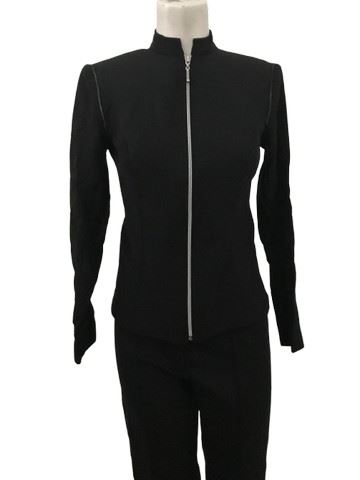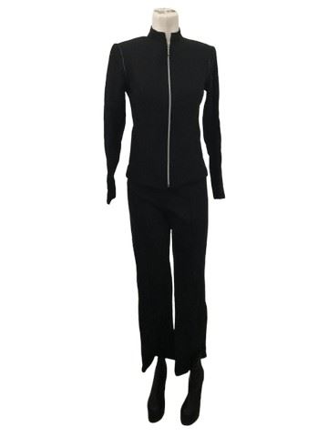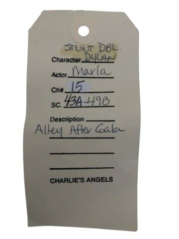 Charlie's Angels: Full Throttle - Dylan's (Drew Barrymore) stunt double's (Marla Casey) screen worn custom made John David Ridge black pants with sleek zip up matching fitted top with shoulder pads. Tag inside pants has "harness" written on it. Tag inside the jacket has Ms. Marla Casey typed into the label). Also includes her worn "Classified" platform heeled black boots. Includes costume department wardrobe tag that states it was used in the after gala scene. Slits in the back sides of the jacket for the harness.