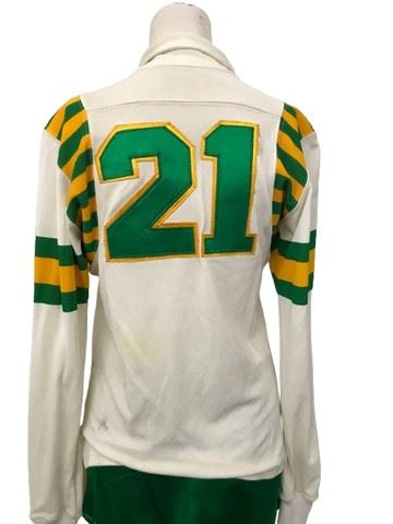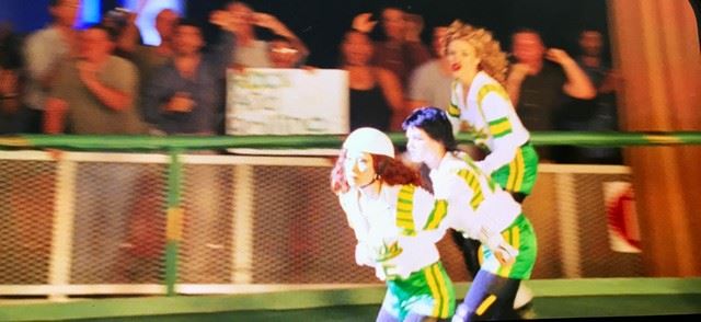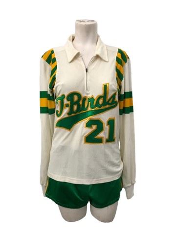 Charlie's Angels: Full Throttle (2003) - Roller derby scene screen used T-Birds costume. Used as stock wardrobe for the film. Not seen on screen in the roller derby clip. Includes a cream colored half zip long sleeve top with green shiny material shorts and yellow stripes. Custom made by production. Looks exactly like the costumes worn on screen by all three of Charlie's Angels.
