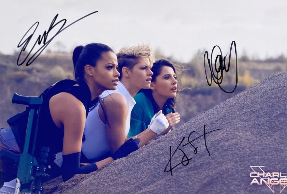 Charlie's Angels cast facsimile signed movie photo autographed by Kristen Stewart, Naomi Scott and Ella Balinska. 8x10 inches. This item is a reprint of an original autograph