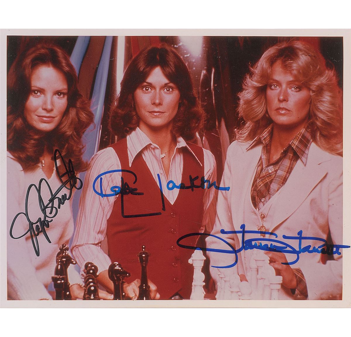 Color glossy 10 x 8 photo of the three original Angels, signed in blue felt tip by Kate Jackson and Farrah Fawcett, and in black felt tip by Jaclyn Smith. In fine condition.