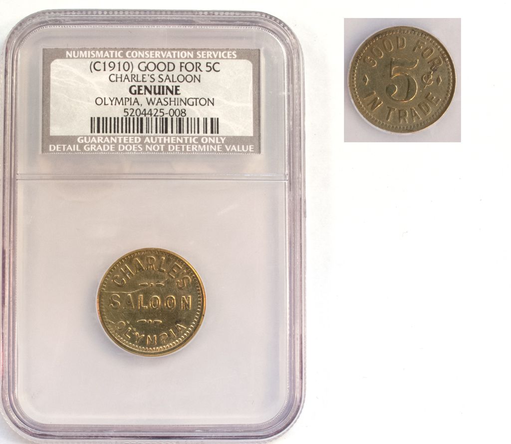 Obv.:Charlie`s / Saloon / Olympia; Rev.: Good For / 5c / In Trade.City: OlympiaCounty: State: WADate: