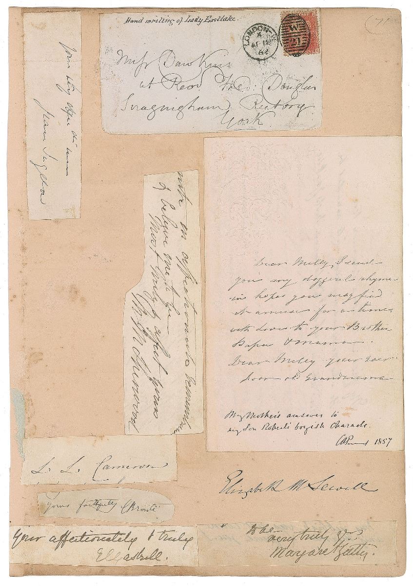 Extremely rare ink signature, "yours faithfully, C. Bronte,” on an off-white 3 x .75 slip irregularly clipped and affixed to a larger scrapbook page which bears the signatures of several other notable British writers, including novelist and Bronte biographer Elizabeth Gaskell, Elizabeth M. Sewell, Margaret Gatty, Jean Ingelow, and Mary Martha Sherwood, as well as an address panel in the hand of Elizabeth Eastlake. Bronte's signature is in fine condition, with a small light stain before the sentiment. Bronte is rare in any form and among the most sought-after autographs in all of English literature—this is one of a handful we've offered in the past decade. Pre-certified PSA/DNA.