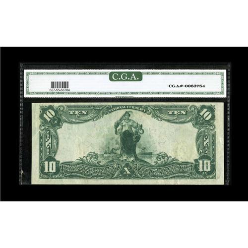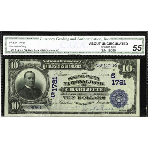 <B>Charlotte, NC</B></I> - $10 1902 Plain Back Fr. 627 <B>The Merchants & Farmers NB</B></I> Ch. # (S)1781<BR>If you have an eye for quality don't pass up the opportunity to acquire this example graded <B>About Uncirculated 55</B></I> by CGA. Strong blue signatures remain on surfaces displaying a couple soft corner folds.