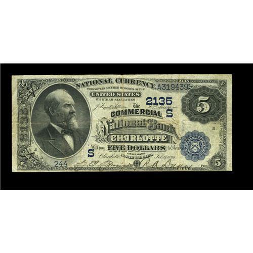 <B>Charlotte, NC</B></I> - $5 1882 Date Back Fr. 534 <B>The Commercial NB</B></I> Ch. # (S)2135<BR>This is hardly a common type or denomination from any North Carolina bank, and this note offers a bonus in its distinctive fancy title layout, something rarely found on Date Backs from any location. <B>Fine-Very Fine.</B></I>