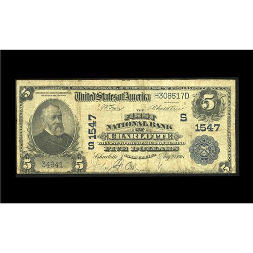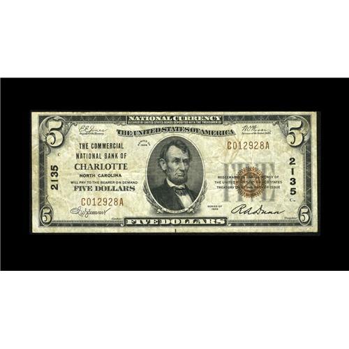 <B>Charlotte, NC</B></I> - $5 1902 Plain Back Fr. 599 <B>The First NB</B></I> Ch. # (S)1547 <B>VG</B></I><BR><B>Charlotte, NC</B></I> - $5 1929 Ty. 1 <B>The Commercial NB</B></I> Ch. # 2135 <B>Fine.</B></I><BR>The First was chartered just four months after Appomattox.