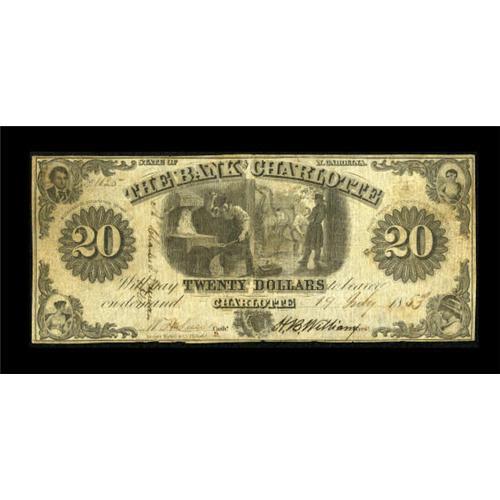 <B>Charlotte, NC- Bank of Charlotte</B></I> $20 July 19, 1853 C14 <BR> This is a very scarce counterfeit of a note which North Carolina paper money researcher J. Roy Pennell states that he has never seen a genuine example. <B>Fine</B></I>.<BR><BR><b>Shipping:</b> Coins & Currency (<a target="_blank" href="http://www.heritageauctions.com/common/shipping.php">view shipping information</a>)