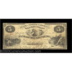 Charlotte, NC- The Bank of Mecklenburg $5 Dec. 29, 1874Notes of this denomination and higher are just plain rare, with offerings few and far between. Fine+, lacking the 2¢ revenue stamp. Important notice: Heritage usually auctions material at the rate of 200-250 lots per hour. On some occasions eBay Live bid software or the Internet may not be able to keep up with the pace of the auction. We recommend placing a realistic absentee bid now as insurance to avoid disappointment. Occasionally the auctioneer may eliminate or reject an eBay Live bid, and the auctioneer may also reopen a lot after the close of the eBay live bidding (usually because we missed an audience bid), and may reject your bid even if it shows you as the winning bidder. By bidding via eBay Live, you agree that Heritage may award the lot to another bidder at its sole discretion under the circumstances described above or any other reasonable circumstances. Also please note that all Heritage lots purchased through eBay Live carry a 20% Buyer's Premium. Please make sure you read the Terms and Conditions before you bid.