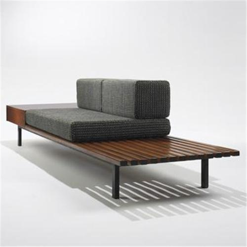 Charlotte Perriand<BR>bench with drawer from Cite Cansado, Mauritania<BR>Galerie Steph Simon<BR>France, 1958<BR>oak, enameled steel, laminate<BR>55 w x 26 d x 29 h inches<BR>Provenance: <BR>Cite Cansado, Mauritania<BR><BR>Condition of the item is not included in this description. Condition reports are available from Wright upon request. Wright strongly recommends that you review a condition report for each item on which you plan to bid.