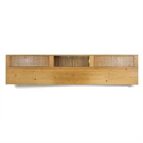 Charlotte Perriand<BR>headboard from Les Arcs, Savoie<BR>France, 1977-81<BR>pine, enameled steel<BR>84 w x 7.5 d x 19.5 h inches<BR>This form was utilized in the residences of La Nova of Arc 1800. Two doors conceal internally lit storage compartment with one recessed shelf. <BR><BR>Condition of the item is not included in this description. Condition reports are available from Wright upon request. Wright strongly recommends that you review a condition report for each item on which you plan to bid.