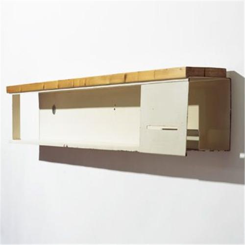 Charlotte Perriand wall-mounted shelf from Les Arcs France, c. 1968 enameled steel, pine 66 w x 5.75 d x 9.5 h inches Literature: <i>Charlotte Perriand: An Art of Living</i>, McLeod, ppg. 152-153 discusses project