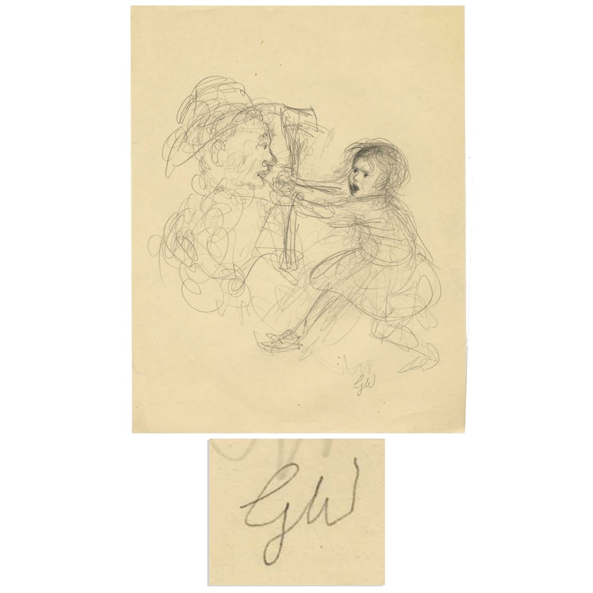 Preliminary illustration by American artist Garth Williams for a scene on page 2 of E.B. White's 1952 book, ''Charlotte's Web.'' This pencil sketch depicts Fern urging her father not to kill Wilbur, the piglet who would become her pet. Williams initials the 8.5'' x 11'' drawing ''GW'' at the lower right and numbers it ''3.16328'' on the verso. Minor creasing, else near fine condition.